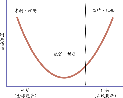 微笑曲线:指导企业竞争战略的经济理论。微笑曲线分成左、中、右三段,左段为技术、专利,中段为组装、制造,右段为品牌、服务,而曲线代表的是获利。微笑曲线在中段位置为获利低位,而在左右两段位置则为获利高位,如此整个曲线看起来像是个微笑符号。微笑曲线的含意是:要增加企业的盈利,绝不是持续在组装、制造位置,而是往左端或右端位置迈进。