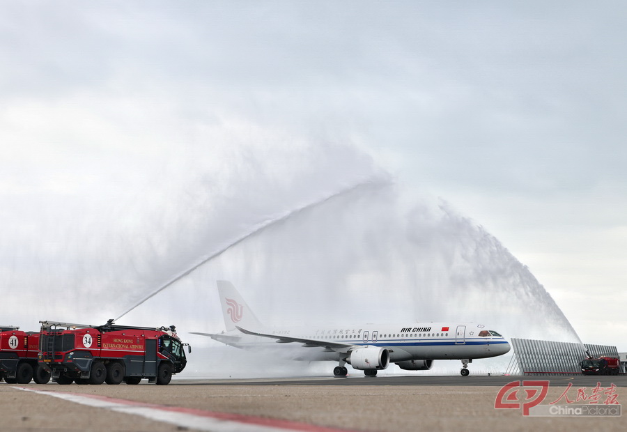 C919载旗首飞北京-香港航线,飞机缓缓穿过水门。 摄影 陶冉