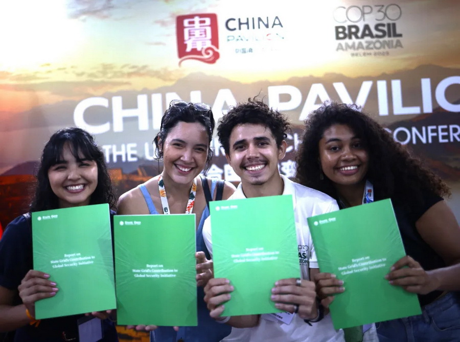 ▲COP30大会中国角观众翻阅国家电网《落实全球安全倡议贡献报告》