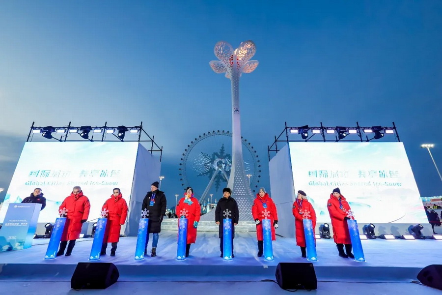 △1月6日,“世界市长对话·哈尔滨”活动启幕仪式举行,嘉宾们点燃“雪韵丁香”火炬塔。