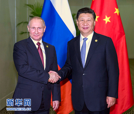 普京表示,很高兴再次同习近平主席会晤,俄中高水平的关系对全球和平稳定十分重要,双方应该保持密切高层交往。当前,俄中双边经贸关系发展势头良好,高新技术等领域合作取得积极成果。俄方期待着同中方共同推进欧亚经济联盟建设同“一带一路”建设对接合作。俄中双方要加强在亚太经合组织等多边事务中协调合作。