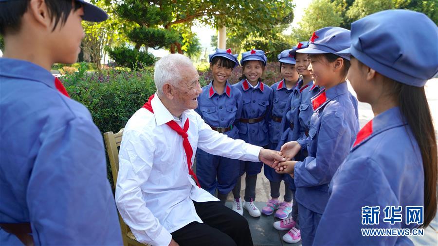 抗战老兵万更志(左二)给江西省于都县长征源小学的学生讲述红色故事(2018年9月29日摄)。新华社记者 胡晨欢 摄