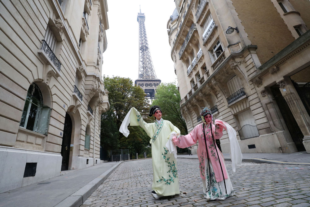 2023年9月13日,江苏省演艺集团昆剧院院长施夏明(左)和江苏省演艺集团昆剧院国家一级演员孔爱萍在法国巴黎埃菲尔铁塔附近参加昆曲快闪。新华社记者 高静 摄