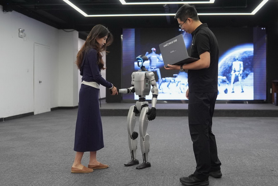 2025年4月23日,在机器人公司杭州宇树科技展厅内,宇树人形机器人G1展示握手动作。新华社记者 黄宗治 摄