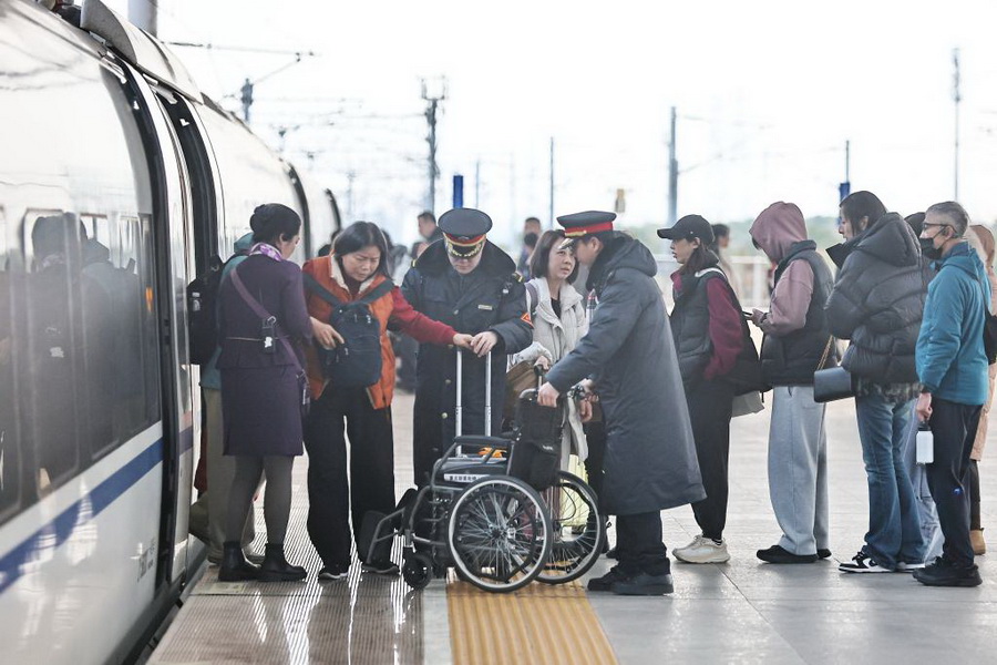 2月19日,在铁路浙江嘉兴南站站台,工作人员搀扶一名腿部受伤旅客下车坐上轮椅车,为其提供出站服务。新华社发(金鹏摄)