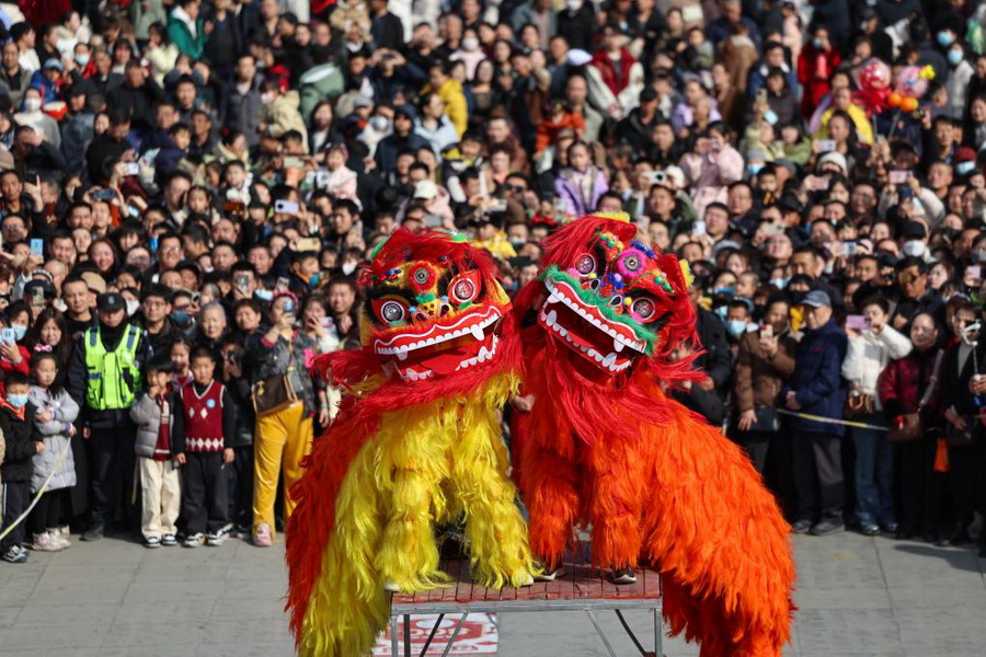 2月18日,人们在甘肃省兰州市七里河区兰州老街观看舞狮表演。新华社发(侯崇慧摄)