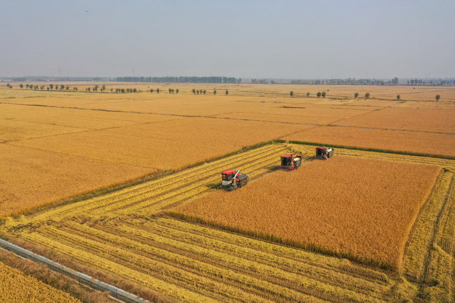 在吉林省公主岭市,吉林省米兜种植农民专业合作社进行机械化收割水稻作业展示(2025年10月14日摄,无人机照片)。新华社记者 张楠 摄