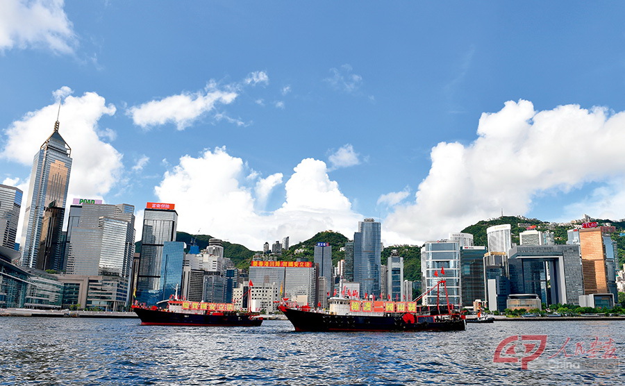 2020年7月1日,100多艘渔船在维港鸣笛巡游,庆祝香港回归祖国23周年。 摄影 卢炳辉/新华社