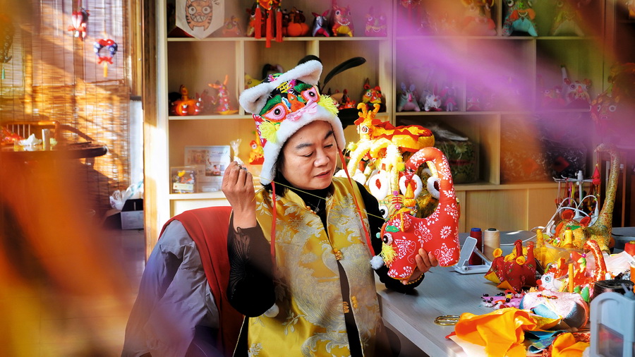 2025年1月9日,农历腊月初十,山东青岛孟家社区的布老虎第五代传承人孙文娟缝制布艺摆件。 摄影 董志刚
