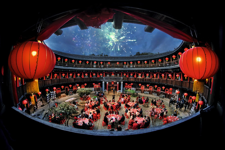 福建龙岩,永定区高北村村民欢聚一堂。客家春节自腊月启幕,一系列习俗活动陆续展开,人们在土楼摆出自制美食,共赴团圆之约。 摄影 张炜