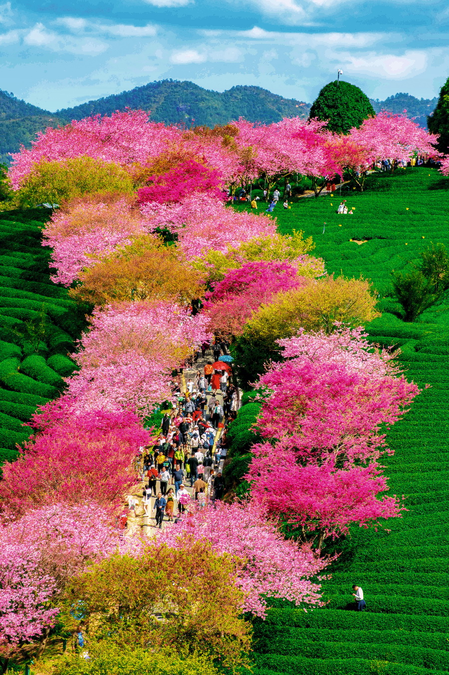 福建龙岩台品樱花园里的樱花与茶田相映,游人穿梭其间,生机盎然。 摄影 陈广程