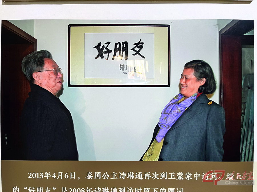 2013年4月6日,泰国公主诗琳通再次到王蒙家中访问。墙上的“好朋友”是2008年诗琳通到访时留下的题词。
