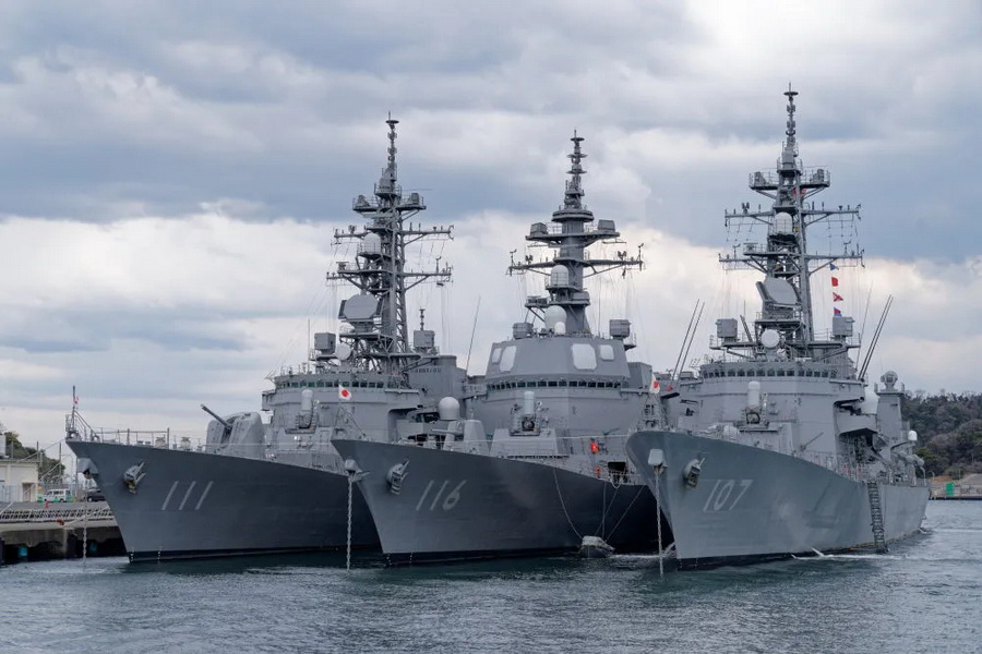 2024年3月20日,在日本神奈川县横须贺市拍摄的停泊在横须贺基地的日本海上自卫队护卫舰。新华社记者 张笑宇 摄