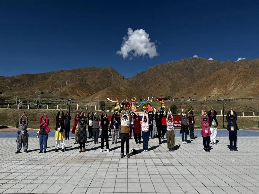 2025年6月,印度香客赴中国西藏冈仁波齐峰和玛旁雍错湖朝圣活动恢复。图为首批经由乃堆拉山口路线前往朝圣的印度朝圣者在西藏自治区白浪县练习瑜伽。(图片来自印度外交部官方发言人X平台贴文)