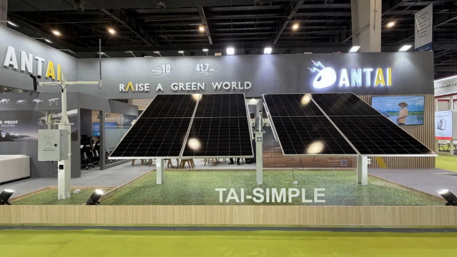 10月30日至11月1日,印度国际可再生能源博览会在印度诺伊达举行。图为中国企业安泰新能源推介其光伏设备。