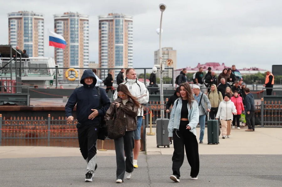 9月15日,俄罗斯免签旅客从黑龙江省黑河水运旅检口岸入境,走向联检大厅。供图/ 新华社