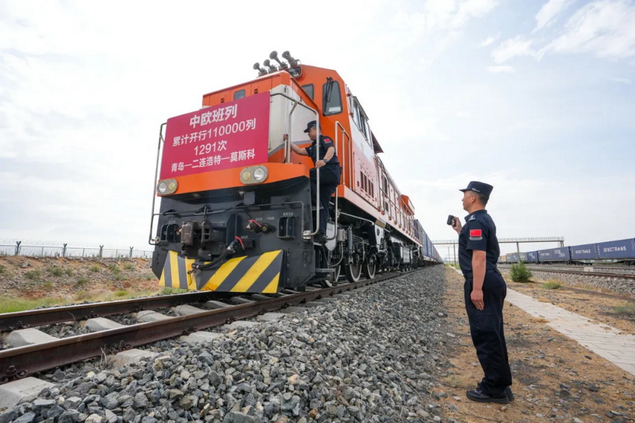 2025年6月12日,内蒙古出入境边防检查总站二连出入境边防检查站移民管理警察对第11万列中欧班列进行车体检查。供图/ 新华社