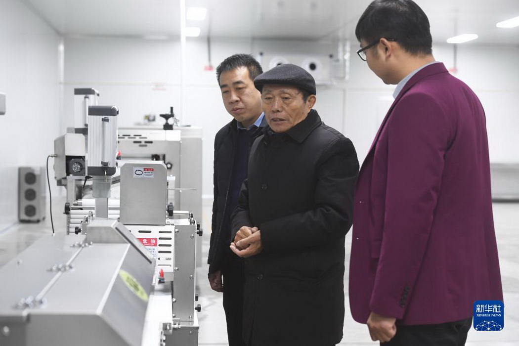 2月21日,在位于河南省濮阳市庆祖镇西辛庄村的食品工业园,李连成(中)查看即将投产的馒头生产线。新华社记者 张浩然 摄