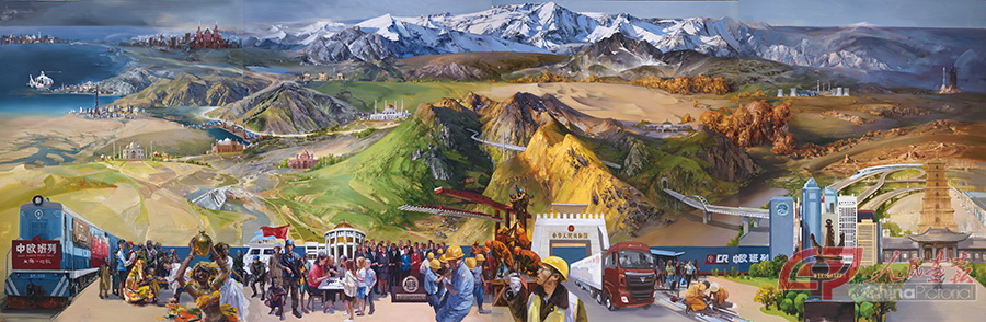 作为本届北京双年展大型主题绘画,油画《丝绸之路新篇章》立足广阔的空间视角,用现实主义的写实语言,全景式展现了丝绸之路经济带在当今世界所焕发出的旺盛生命力和时代精神。画面远景着重刻画沿线最具代表性的自然人文地貌;中景起始于中国西安大雁塔的一条由公路、铁路、桥梁组成的平坦大路蜿蜒向前,将中国与蒙古国、俄罗斯、哈萨克斯坦、巴基斯坦、印度、孟加拉国、阿联酋、土耳其、荷兰等亚欧国家紧密连接在一起,其间贯穿着“一带一路”重大工程符号,如酒泉卫星发射基地、“和谐号”动车、喀纳斯热电厂、喀什中西亚国际贸易市场、“亚投行”、经合组织、巴基斯坦跨国公路、新亚欧大陆桥起点、巴基斯坦瓜达尔港、中国援建的越南水坝等;近景则用中欧班列串联,依次描绘基础设施援建工人、哈萨克斯坦纳扎尔巴耶夫大学(习近平主席于2013年9月在此首倡共建“丝绸之路经济带”的伟大构想)、孔子学院、边贸运输、维和部队、援非医疗等,表现出“一带一路”造福沿途各国人民的热烈场景。