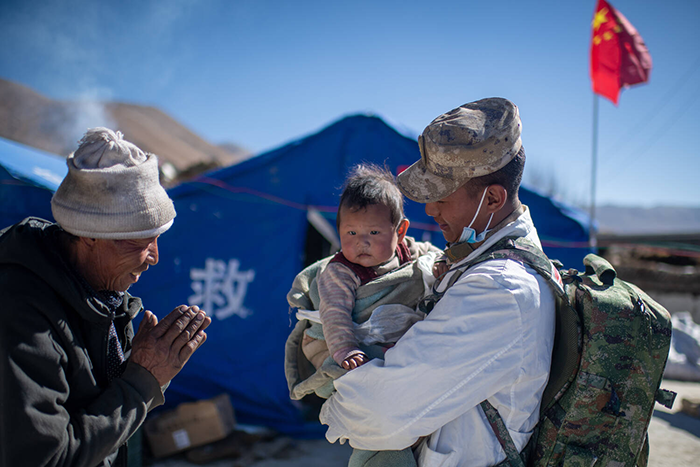 2025年1月9日,西藏自治区日喀则市长所乡古荣村安置点,受灾群众感谢西藏军区陆军某部队卫生员的医疗救治。摄影 翁奇羽