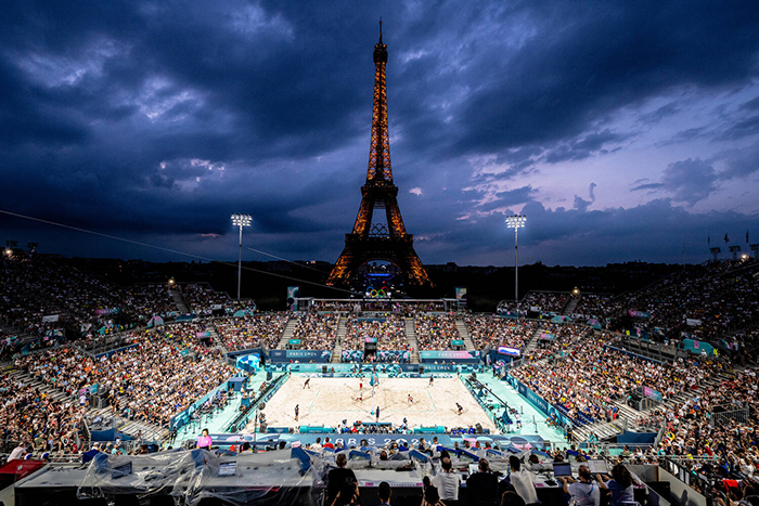 当地时间2024年8月1日,法国巴黎,沙滩排球小组赛正在埃菲尔铁塔体育场进行。摄影 李隽辉