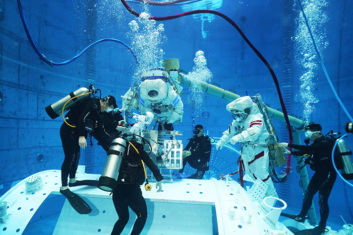 2025年3月14日,北京航天城,神舟二十号航天员在进行出舱程序的水下训练。摄影 徐部