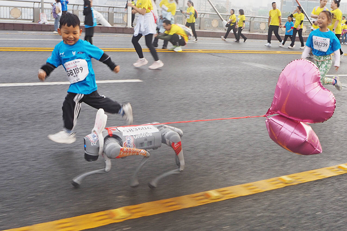 2024年11月10日,江西南昌,2024南昌马拉松鸣枪开跑,一名参赛儿童与马拉松“欢乐跑陪跑狗”在八一大桥上并肩前行。摄影 刘占昆