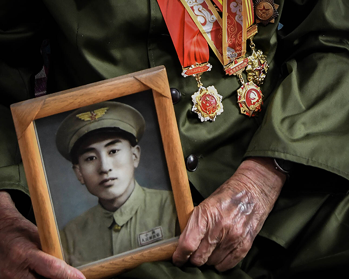 2024年6月8日,吉林长春,时年99岁的抗战老兵薛级臣,用布满皱纹的双手紧紧握着自己年轻时身着戎装的照片。摄影 付丽华
