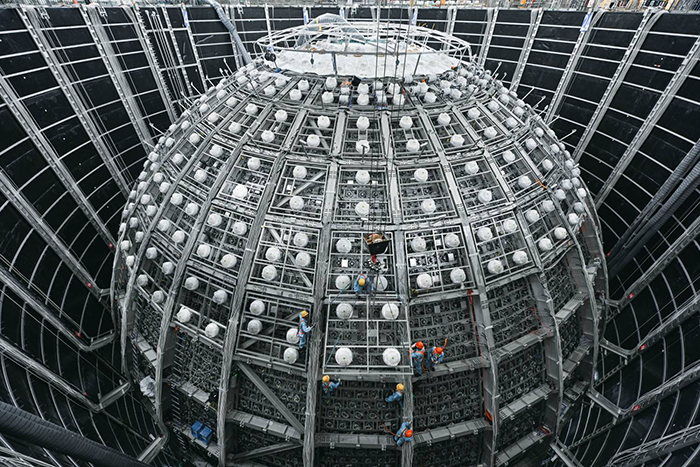 2015年起,广东江门地下700米深处,全球最大中微子探测器——江门中微子实验(JUNO)开启建设。2023年8月16日,中心探测器外工人正在高空安装光电倍增管模块。摄影 刘悦湘
