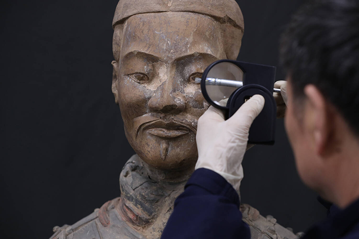 2023年4月3日,陕西西安,秦始皇帝陵博物院文物修复专家兰德省用毛笔将医院眼科临床上常用的聚乙二醇滴眼液涂抹在兵马俑的眼睛上。这种方式能慢慢地浸润清理残留在兵马俑眼角的细小微生物,对兵马俑起到保护作用。摄影 邹红