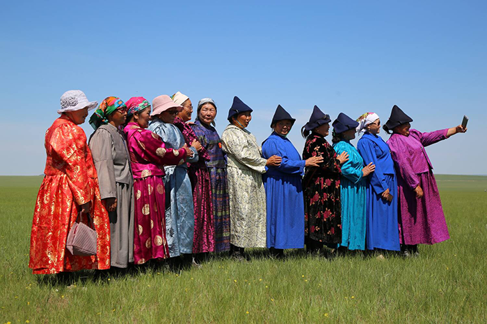 2018年6月23日,内蒙古自治区呼伦贝尔市鄂温克族自治旗,参加聚会的牧民穿着漂亮衣饰在草原上留影。摄影 巴义尔
