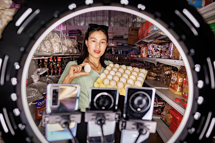 2024年5月1日,四川省凉山彝族自治州盐源县麦架坪村,村民杨丽在自己的超市里尝试网络直播销售土鸡蛋等农产品。摄影 邹森