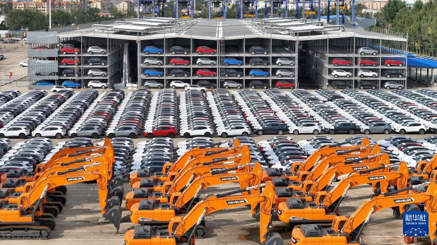 10月20日,国产汽车和工程机械在山东港口烟台港集结等待装船出口(无人机照片)。新华社发(唐克摄)