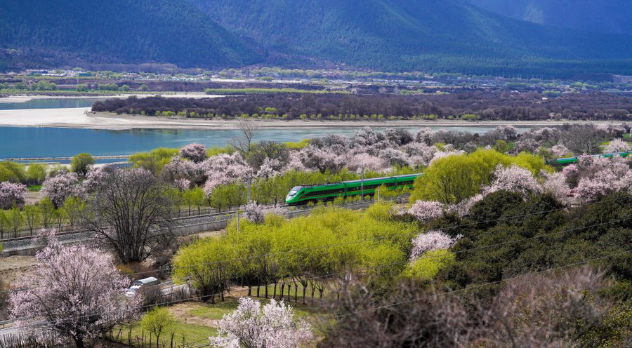 2025年4月2日,“复兴号”列车穿行在拉林铁路林芝段。新华社记者 晋美多吉 摄