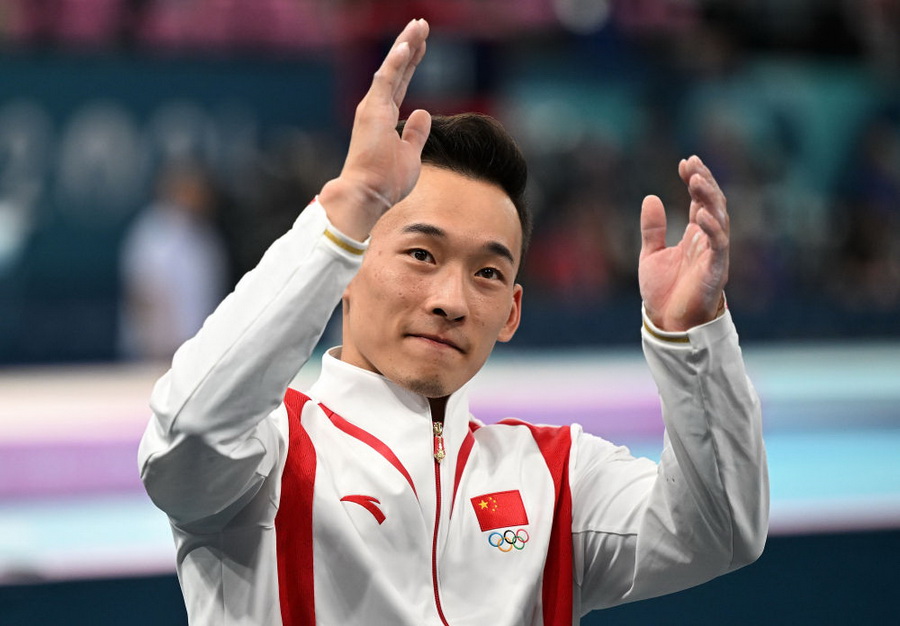 2024年7月31日,肖若腾在巴黎奥运会体操男子个人全能决赛后。新华社记者 程敏 摄