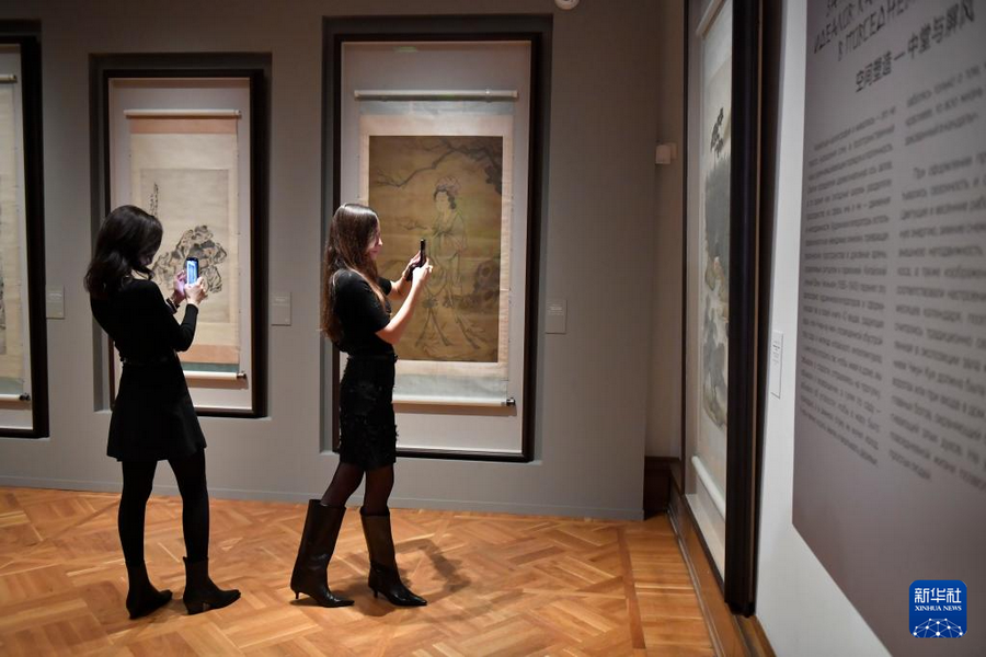 11月17日,在俄罗斯莫斯科特列季亚科夫画廊,嘉宾参观“心之所向:中国国家博物馆藏14—19世纪中国书画艺术”展览。新华社发(亚历山大摄)