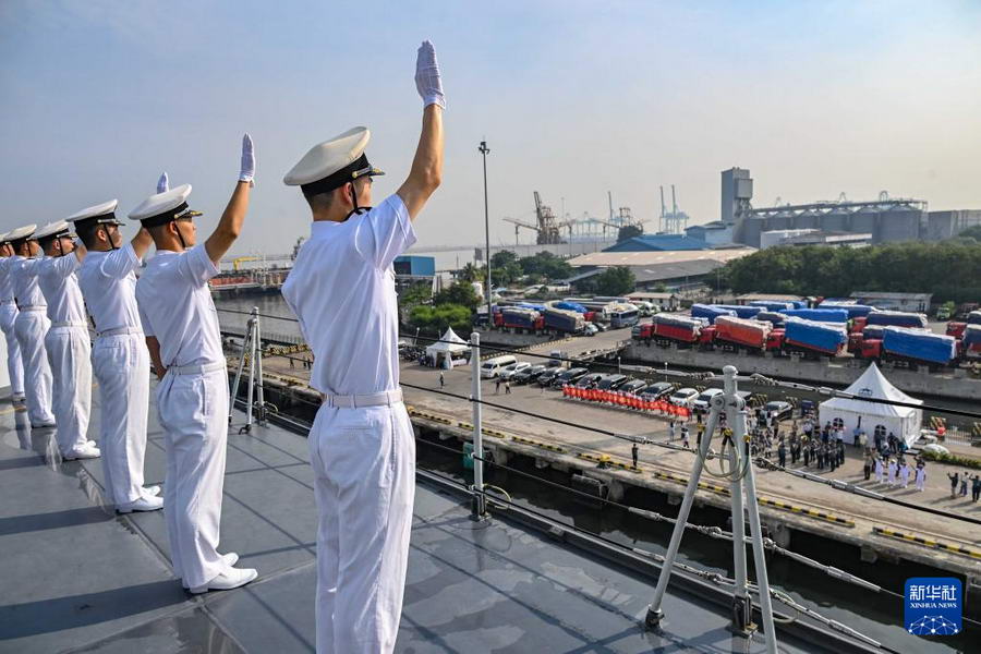 当地时间8时许,印尼方在丹戎不碌港举行欢送仪式,中国驻印尼大使馆工作人员、当地中资企业和华侨华人代表、印尼海军官兵代表来到码头送行。来自海军工程大学和海军航空大学的学员在甲板上分区列队,向送行队伍挥手道别。