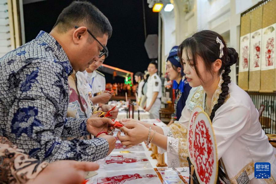 12月9日,中国海军989编队在长白山舰举行甲板招待会,华侨华人体验剪纸文化。新华社发(于涛 摄)