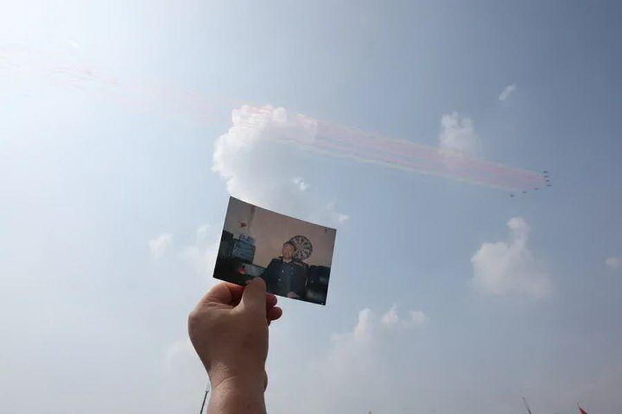空中梯队飞过天安门广场时,王伟烈士的妻子阮国琴在观礼台上把王伟的照片举向蓝天。