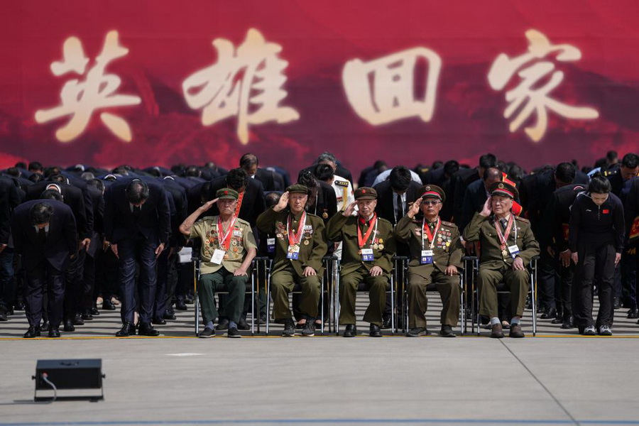 9月12日,第十二批在韩中国人民志愿军烈士遗骸回国。这是志愿军老战士在沈阳桃仙国际机场举行的迎回仪式上敬礼。