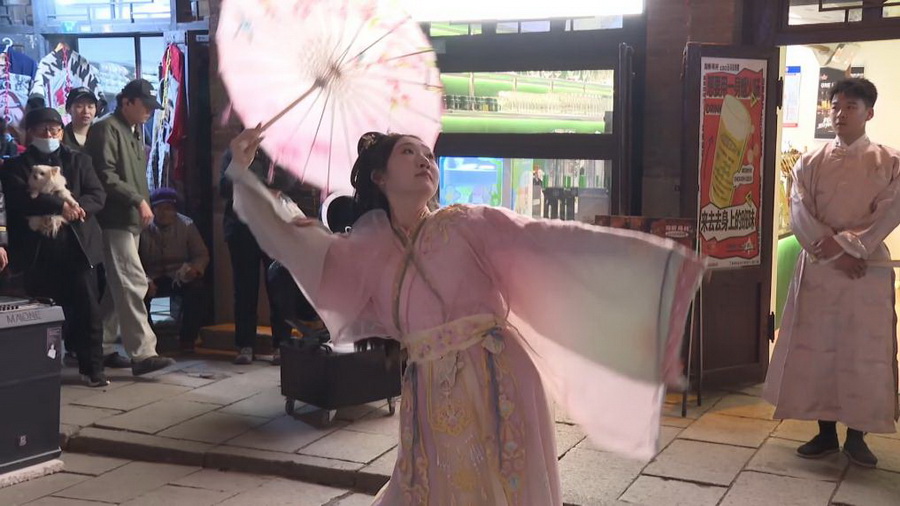 华灯初上,周村古商城悄然变身冬日浪漫胜地。雪花机喷洒出纷扬的“雪花”,身着精美汉服的舞者翩翩起舞,在光影交织中演绎出一幅富有诗意的国风画卷。