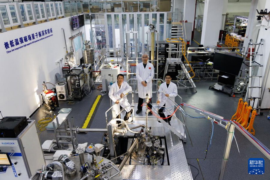 1月26日,实验站负责人、副研究员李岗,中国科学院电工研究所研究员刘建华、中国科学院电工研究所博士后周本哲(从左至右)在位于北京怀柔的中国科学院物理研究所综合极端条件实验装置极低温强磁场量子振荡实验站合影。新华社记者 金立旺 摄