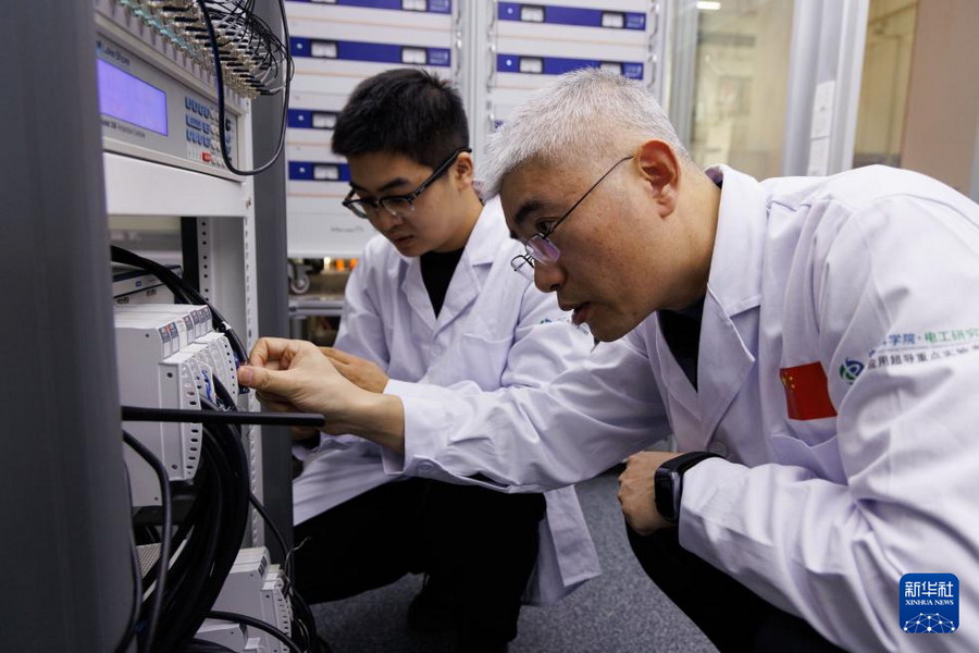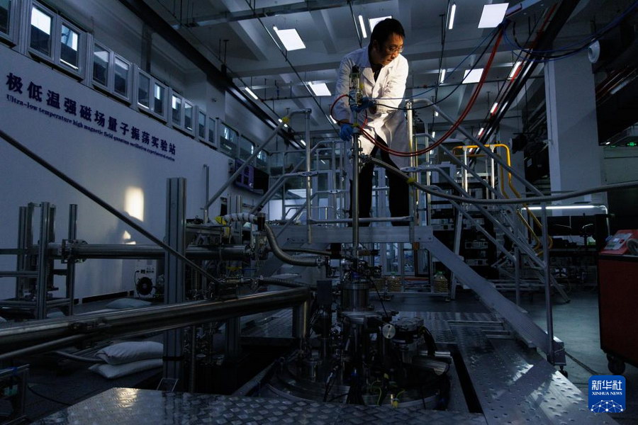 1月26日,在位于北京怀柔的中国科学院物理研究所综合极端条件实验装置极低温强磁场量子振荡实验站,中国科学院电工研究所研究员刘建华(右)、中国科学院电工研究所博士后周本哲在工作中。新华社记者 金立旺 摄