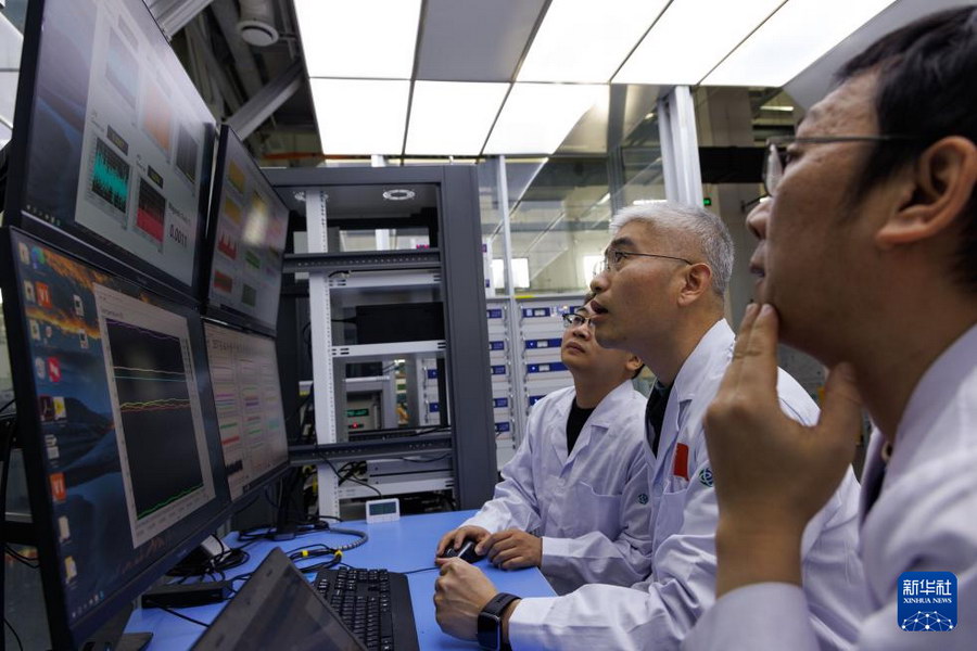1月26日,实验站负责人、副研究员李岗,中国科学院电工研究所研究员刘建华、中国科学院电工研究所博士后周本哲(从左至右)在位于北京怀柔的中国科学院物理研究所综合极端条件实验装置极低温强磁场量子振荡实验站讨论全超导用户磁体的运行情况。新华社记者 金立旺 摄