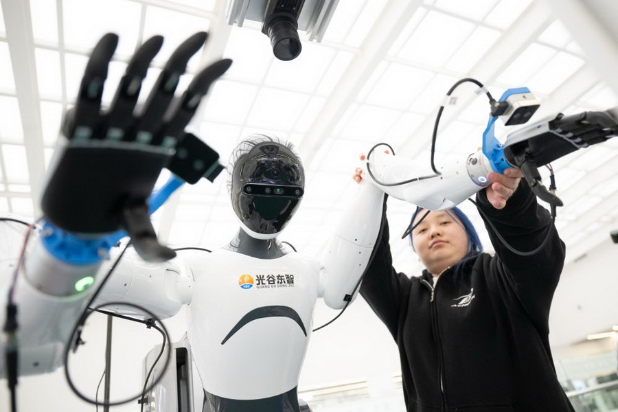 2025年12月4日,在湖北人形机器人创新中心,工作人员对人形机器人进行调试作业。新华社记者 肖艺九 摄