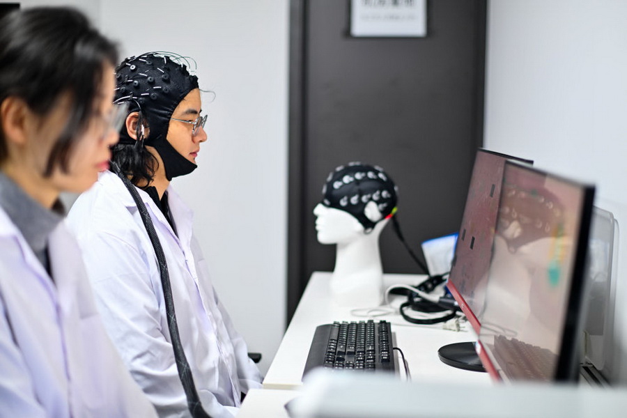 2026年2月27日,在位于天津滨海高新区的中电云脑(天津)科技有限公司,工作人员进行脑机接口技术测试。新华社记者 赵子硕 摄