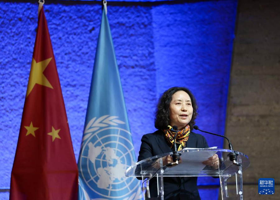 3月18日,在法国巴黎,中国常驻联合国教科文组织大使衔代表杨新育在活动上致辞。新华社记者 邬惠我 摄