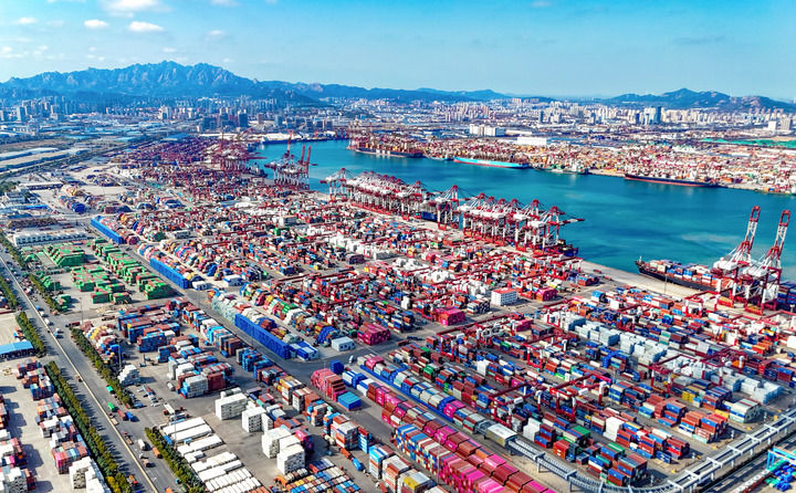 货轮在青岛自贸片区装卸货物(2025年11月5日摄,无人机照片)。新华社发(张进刚 摄)
