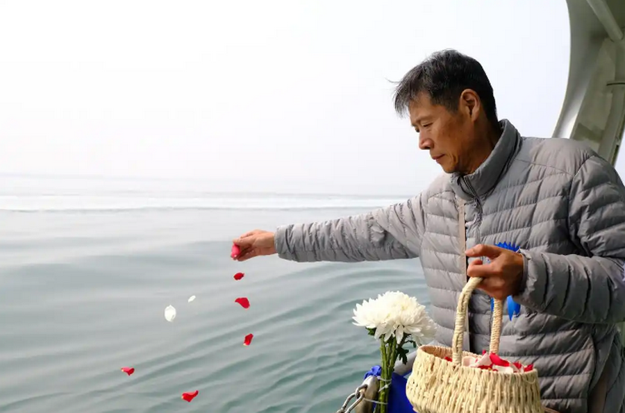 在3月29日举行的2026年京津冀骨灰海葬启航活动中,一位逝者家属在完成骨灰海葬仪式后将花瓣撒向大海。新华社记者 夏子麟 摄