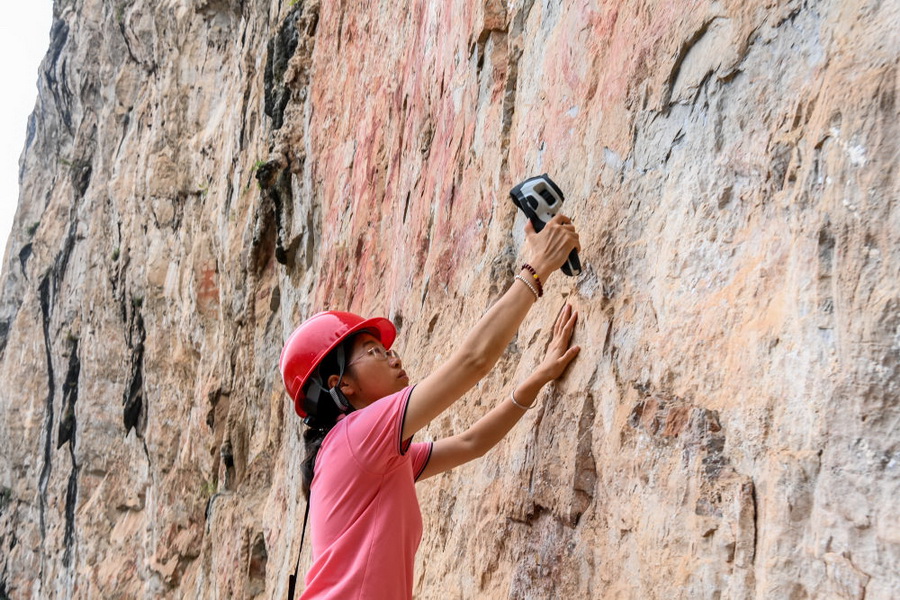 2025年6月19日,工作人员在位于广西崇左宁明县的一处花山岩画区域测量岩壁表面温度。花山岩画由战国至东汉时期生活在左江流域的先民所作,主要分布在广西崇左市境内,距今已有两千多年的历史,2016年被列入《世界遗产名录》。当地建立了花山岩画保护监测站,不断完善岩画监测预警体系建设。强化对花山岩画本体及周边环境的监测、监控和预警。岩体监测数据实时上传国家文物局数据监测平台,用科技手段提升岩画安全保存水平。
